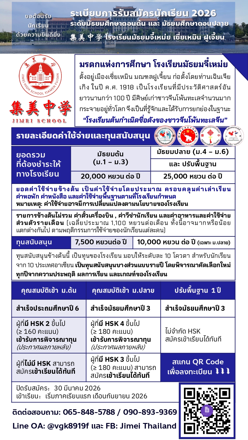 เปิดรับสมัครเข้าศึกษาโรงเรียนมัธยมจี๋เหม่ย(福建省厦门集美中学)ปีการศึกษา 2026