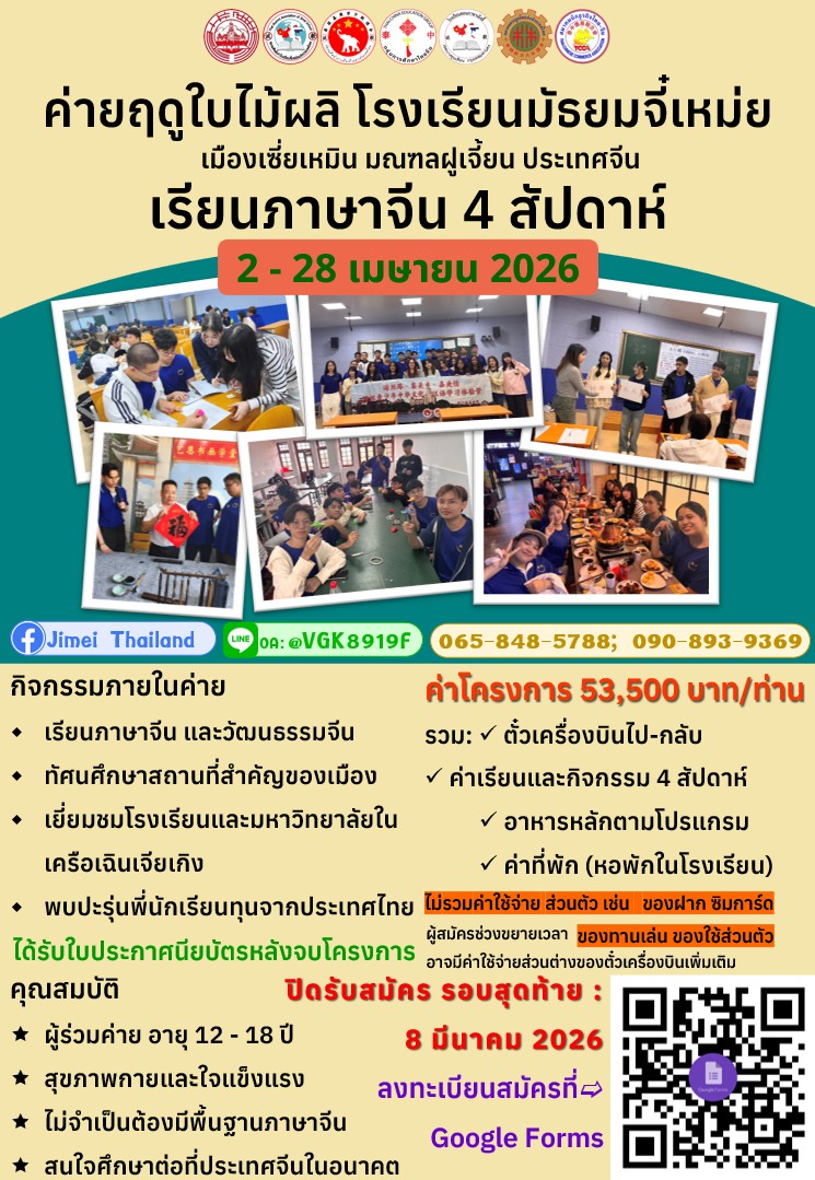 เปิดรับสมัครค่ายฤดูใบไม้ผลิ โรงเรียนมัธยมจี๋เหม่ย เมืองเซี่ยเหมิน มณฑลฝูเจี้ยน วันที่ 2 - 28 เมษายน 2026 (ระยะ 4 สัปดาห์)